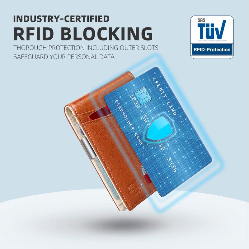 Seguridad y privacidad: esta cartera delgada para hombre está equipada con tecnología de seguridad RFID certificada por el Instituto Alemán, un compuesto de metal único, diseñado específicamente para bloquear señales de interferencia de radiofrecuencia RFID de 13.56 MHz o más altas y proteger la valiosa información almacenada en chips RFID de escaneos no autorizados.
