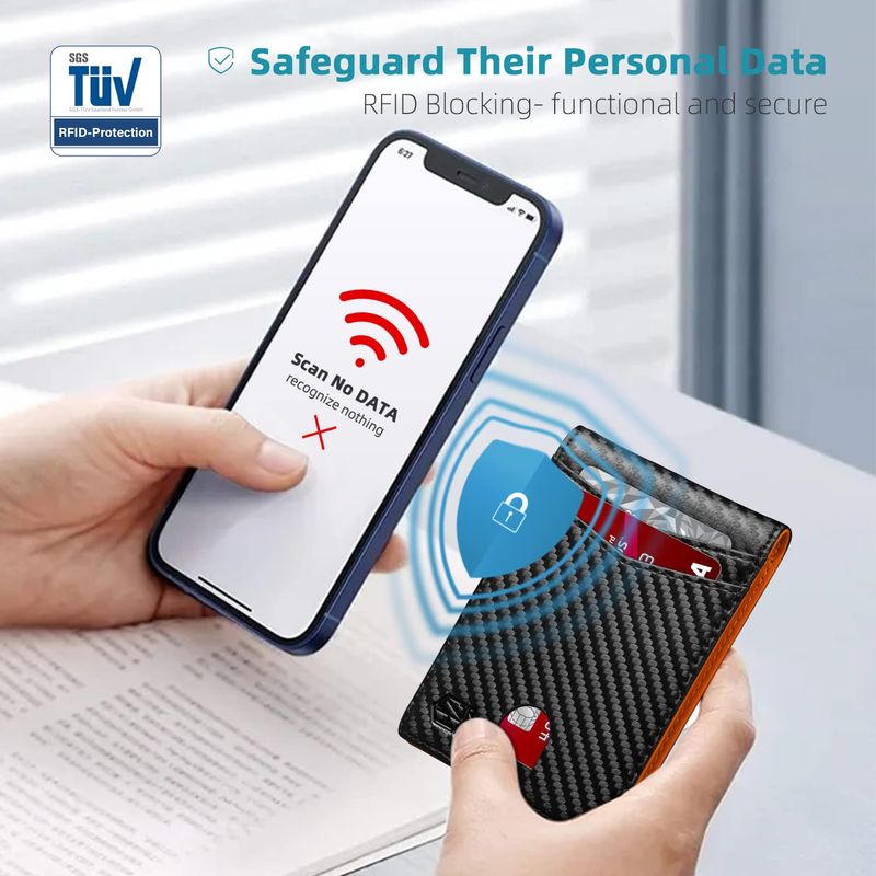 Seguridad y privacidad: esta cartera delgada para hombre está equipada con tecnología de seguridad RFID certificada por el Instituto Alemán, un compuesto de metal único, diseñado específicamente para bloquear señales de interferencia de radiofrecuencia RFID de 13.56 MHz o más altas y proteger la valiosa información almacenada en chips RFID de escaneos no autorizados.