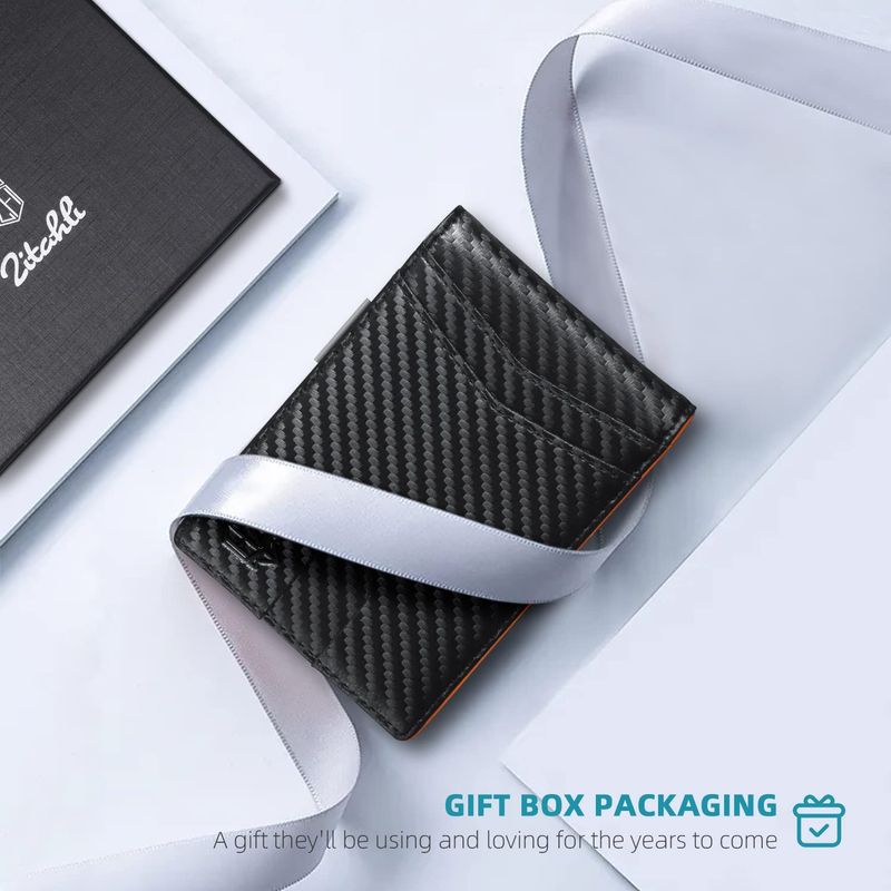 ZITAHLI - CARTERAS DELGADAS CON CLIP PARA DINERO PARA HOMBRE, TARJETERO MINIMALISTA, DE CUERO, PLEGABLE, CON BLOQUEO RFID, CARTERA DE BOLSILLO CON 12 RANURAS PARA TARJETAS, CON CAJA DE REGALO, NEGRO CARBóN Y NARANJA