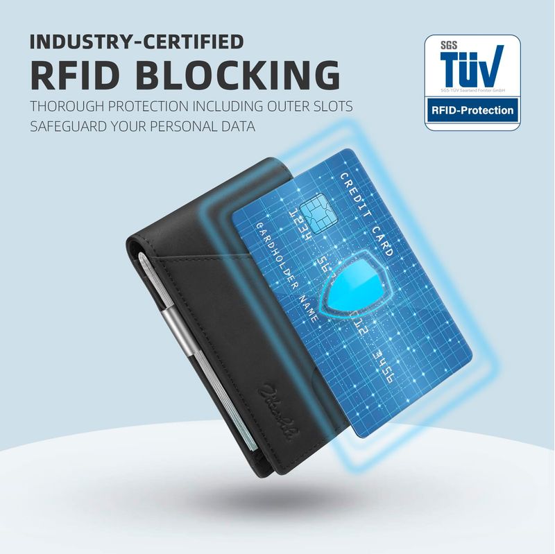 Protección de bloqueo RFID: esta cartera RFID para hombre está probada por un instituto de control de calidad alemán independiente, específicamente para bloquear señales RFID de 13.56 MHz o superiores y proteger contra el robo de datos por escáneres RFID.